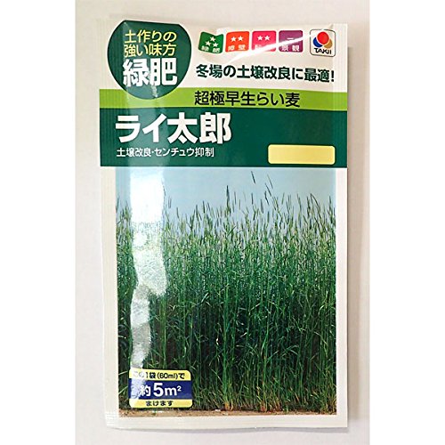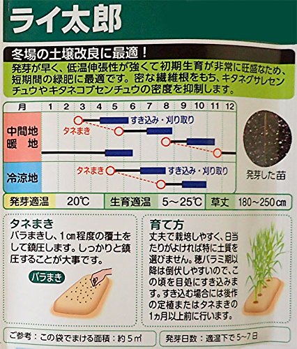 - 家庭菜園等の土壌改良に少量パッケージのらい麦ライ太郎の種です。発芽が早く、低温伸張性が強くて初期生育が非常に旺盛なため、短期間の緑肥に最適です。密な繊維根を持ち、キタネグサレセンチュウ、キタネコブセンチュウの密度を抑制します。まきどき:中間地・暖地(3~5月、8~11月)、冷涼地(5~8月)発芽適温:20℃位生育適温:5~25℃草丈:180~250cm内容量:60ml※約5平方メートル分です。★種袋のデザインが変わる場合があります。