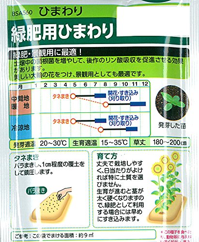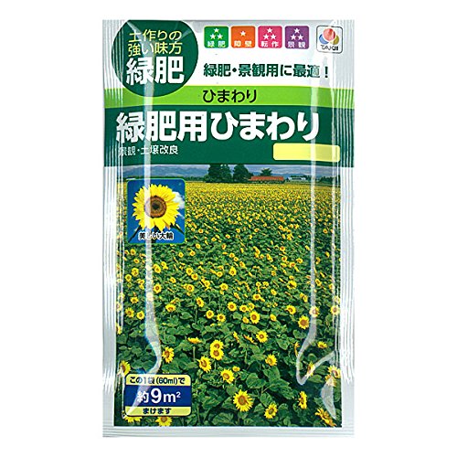 - 緑肥用ヒマワリは菌根菌の密度を高め、後作のリンサン吸収を促進します。初期成育が旺盛で、土壌の被覆が早く、雑草をよく抑えます。播種期の幅が広く、1日当たりの乾物生産量も多いので緑肥作物として優れています。また菌根菌の一種、VA菌の密度を高めるので、リンサン吸収を菌根(マイコライザ)に大きく依存している小麦、大豆、菜豆、とうもろこし、たまねぎなどの前作に利用できます。 まきどき:5~8月 栽培方法: 播種前に耕起して、土をよくほぐしてください。 種をまいた後は土をかけ、平らにならしてください。 発芽までと初期成育の期間は土が乾かないように管理し、必要に応じて潅水してください。 すきこみ: 後作の定植または播種の1ヶ月前にすきこんでください。塩類濃度(EC)が1.5以上を示す後地土壌へのすきこみは塩類障害を助長する危険性があります。このような畑では、茎葉を外に運び出し、養分の不足している畑にすきこんでください。また、成熟しすぎると茎が硬化するので、早めにロータリーなどですきこんでください。