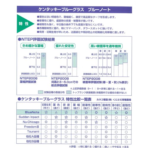 - ケンタッキーブルーグラス ブルーノートは、サッカー場やゴルフ場などのスポーツターフ用(業務用)の西洋芝の種です。ケンタッキーブルーグラスの中では非常に耐暑性に優れ、盛夏時の密度・被覆率が高い品種です。耐陰性も優れ、半日陰の条件下でも密度が落ちにくいです。葉色は淡い明緑色で、葉幅は細く、緻密で高品質なターフを形成します。各種耐病性に優れ、特にサマーパッチ、ダラースポットに強いです。発芽・初期生育が早いため、法面緑化や飛砂防止の初期緑化用草種に適しています。
