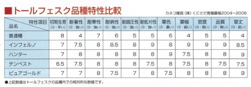 - 品種名:INFERNO Turf Type Tall Fescue 草丈(平坦地参考):45~70cm 純度:95% 発芽率:80% 発芽適温:20度前後 粒数:500粒/g 生産地:アメリカ(入荷時期、ロットにより生産地が異なる事があります) 成育型及び地下器官:そう生型・地下茎 播種適期:3月~6月・9月~11月(平暖地)、5月~8月(冷涼地) 用途:ゴルフ場、競技場、校庭、公園、緑地帯、法面緑化、飛砂防止 播種量: ・トールフェスクのみの芝地は15~20g/平方メートル ・寒地型ベース芝へのオーバーシードは30~60g/平方メートル ・他寒地型草種との混合比は全播種量の重量比で20~70% ・法面緑化及び飛砂防止工事は5~15g/平方メートル (上記は標準的な播種量です。播種地の状況により播種量を加減してください)