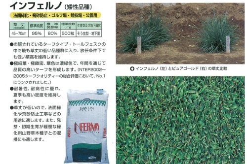- ゴルフ場やサッカー場などのスポーツターフ用(業務用)の西洋芝の種トールフェスク インフェルノです。市販されているターフタイプ・トールフェスクの中で最も草丈の低い品種群に入り、放任条件下でも低い草高を維持します。極細葉、極緻密、葉色は濃緑色で、年間を通じて品質の高いターフを形成します(NTEP2001~2002、トールフェスクのターフクオリティーと葉幅の総合評価において、No.1にランクされました)。耐暑性、耐病性に優れ、夏季も高い密度を維持します。草丈が低いことから、法面緑化や飛砂防止工事に向いており、発芽・初期生育が緩やかな緑化用山野草木種子との混播適性に優れます。