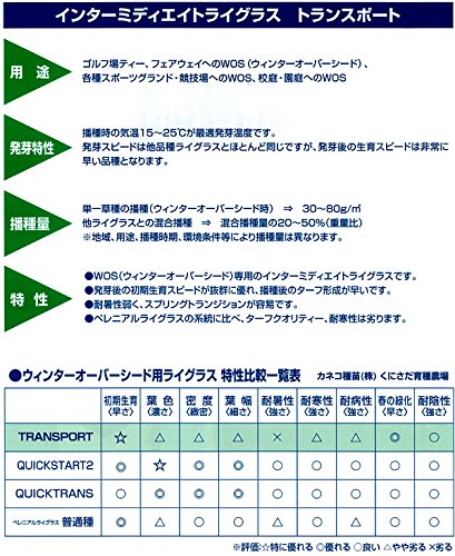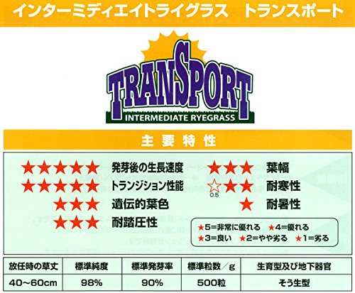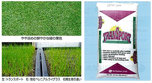 ウィンターオーバーシード(冬に地上部が枯れる高麗芝などの芝生に秋まきして、冬もグリーンの芝を作る)専用の西洋芝(芝生)の種です。IMR(インターミディエイトライグラス)トランスポートは、発芽後の初期生育スピードが抜群に優れ、播種後のターフ形成が早いです。発芽スピードは他品種のライグラスとほとんど同じですが、発芽後の生育スピードが非常に早い品種です。また、耐暑性が弱いので、スプリングトランディション(春になると枯れ、ベースの高麗芝やティフトンの生育が促されること)が容易です。ペレニアルライグラスの系統に比べ、ターフのクオリティー、耐寒性は劣ります。ゴルフ場ティー、フェアウェイ・各種スポーツグランド・競技場・校庭・園庭へのウインターオーバーシードに向いています。別売の「ペレニアルライグラス クイックスタート2」よりも春に枯れ始めるのが早いので、ご家庭や校庭などで使いやすい品種です。芝生の質は「ペレニアルライグラス クイックスタート2」よりも劣るため、プロ用サッカーグラウンドなどの業務用には向きません。
