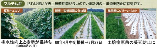 - 写真は利用例(カボチャの敷きワラ代替利用)です。 かぼちゃ、コンニャク、きゅうり、ハクサイ、果樹などの栽培に利用されています。 詳しい説明は マルチムギ:品種の特性・栽培体系例 (Amazonでは 'マルチムギ:品種の特性・栽培体系例' へのリンクは掲載されません) をご覧ください。