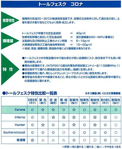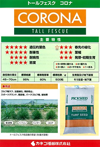 - 放任条件下で優れた環境適応能力を発揮し、強健に生育します。 各種耐病性に優れ、特にレッドスレッド、リーフスポットに高い耐性を有します。 発芽後の生育がやや緩慢であること、草丈が低いことから法面緑化用の山野草木種子との混播適性に優れます。 品種名:CORONA Turf Type Tall Fescue 草丈(平坦地参考):45~70cm 純度:95% 発芽率:80% 発芽適温:20度前後 粒数:500粒/g 生産地:アメリカ(入荷時期、ロットにより生産地が異なる事があります)