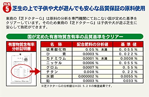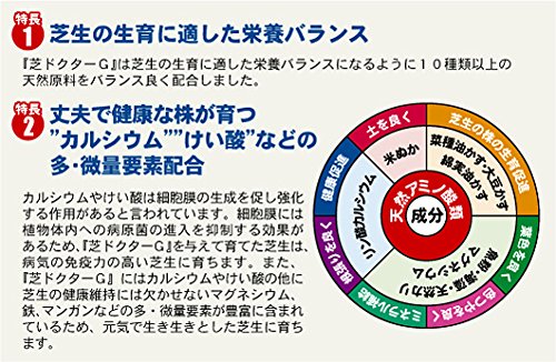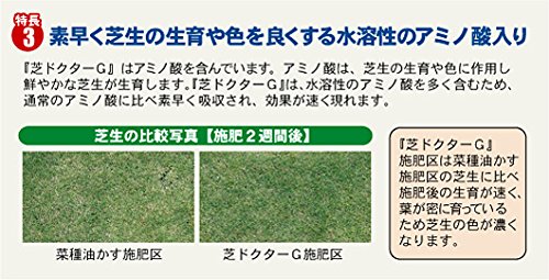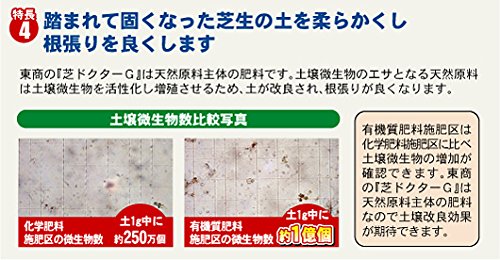 - 土壌微生物を活性化させ、踏まれて固くなった芝生の土をやわらかくし、根張りを良く芝生の上で子供や犬などが遊んでも安心な品質保証の原料使用 ●施肥量 ○コウライシバ(追肥) 1平米あたりの施肥量 4月=25g(2回) 5月=50g(2回) 6月=50g(1回) 10月=50g(2回) 11月=50g(2回)