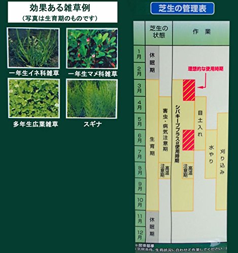 - 芝生に生える雑草の除草&予防効果と肥料効果で芝生をキレイに育てます。粒状タイプでそのままパラパラまくだけ。散布しやすいボトル入りです。ゴルフ場で使われている除草成分「トリアジフラム」を家庭用に初めて配合。さらに肥料成分がプラスされた芝生の生育をやさしく促しながら、雑草は根までしっかり枯らす芝生用の肥料入り除草剤です。●他の芝生用除草剤では駆除しづらいメヒシバやスズメノカタビラ等のイネ科一年生雑草にも効果を発揮(雑草発生前から発生初期まで)●肥料効果も雑草予防効果も約3ヶ月持続。※天候、土壌条件、散布量等により差が生じることがあります。●人やペットへの安全性が高い除草剤です。使用方法:粒をそのままパラパラとまいてください。1平米あたり20~40gを雑草発生前~発生初期に散布します。成分:トリアジフラム(トリアジン系)、DBN(ニトリル系)N-P-K-Mg:11.0-8.0-7.0-3.0容量:1キログラム適用面積:約25~50平方メートル(約7.5~15坪)