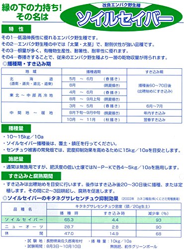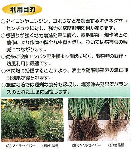 - ソイルセイバーは低温伸長性に優れる品種で、太葉・太茎で耐倒伏性が強く、早生品種の中では収量性があります。 緑肥利用(キタネグサレセンチュウ抑制)としても抜群の効果があります。 播種量:6~10kg/10a(播種量は播種時期、圃場条件によってことなります)
