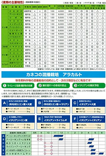 - タイプ:イネ科 まき時:暖地3~5月、8~12月(北海道、東北、中部高冷地では、4~9月上旬まで随時播種可能です) すき込み:5~7月、11~4月(寒地は6~11月) 播種量:10アールあたり10~15kg(線虫被害の常発している畑では、線虫密度抑制効果を高めるために、10アールあたり15kgとします) 乾物重:700~1000kg(10アールあたり) 主な導入利用例:ダイコン・ニンジン・ゴボウなど根菜類に多発するキタネグサレ線虫対策、およびキスジノミハムシの忌避対策に有効。