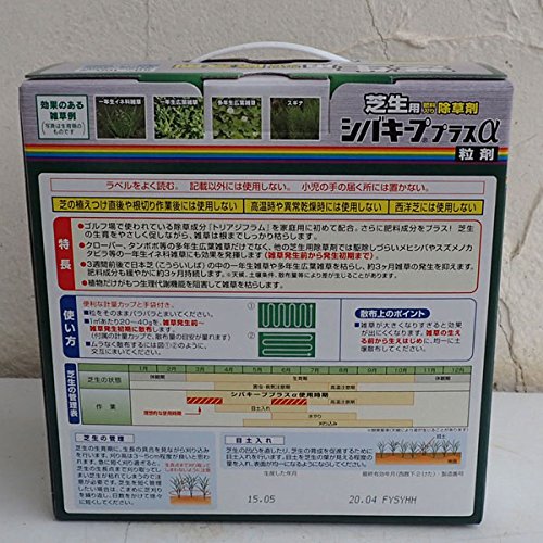 - 芝生に生える雑草の除草&予防効果と肥料効果で芝生をキレイに育てます。粒状タイプでそのままパラパラまくだけ。散布しやすいボトル入りです。ゴルフ場で使われている除草成分「トリアジフラム」を家庭用に初めて配合。さらに肥料成分がプラスされた芝生の生育をやさしく促しながら、雑草は根までしっかり枯らす芝生用の肥料入り除草剤です。●他の芝生用除草剤では駆除しづらいメヒシバやスズメノカタビラ等のイネ科一年生雑草にも効果を発揮(雑草発生前から発生初期まで)●肥料効果も雑草予防効果も約3ヶ月持続。※天候、土壌条件、散布量等により差が生じることがあります。●人やペットへの安全性が高い除草剤です。使用方法:粒をそのままパラパラとまいてください。1平米あたり20~40gを雑草発生前~発生初期に散布します。成分:トリアジフラム(トリアジン系)、DBN(ニトリル系)N-P-K-Mg:11.0-8.0-7.0-3.0容量:2キログラム※計量カップと手袋付適用面積:約50~100平方メートル(約15~30坪)