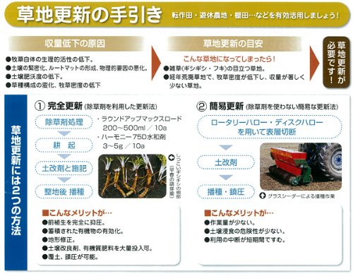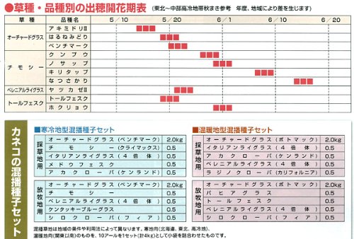 - 温暖地に適した、牧草種子のミックス製品です。 バランスの取れた混播草地を形成します。 関東地方以南向きで、10アール分(4kg)入りです。