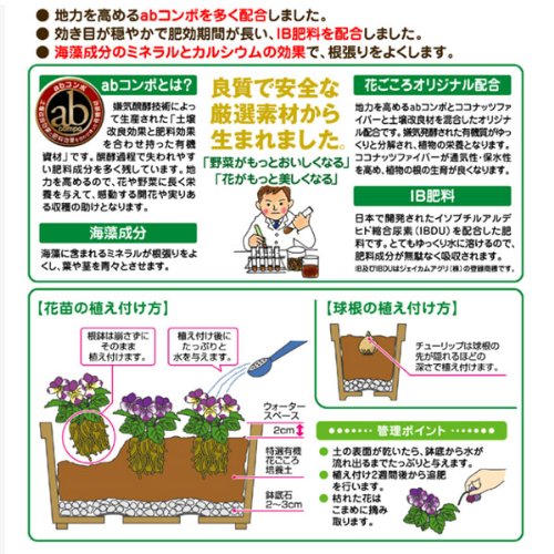 - 軽くて清潔、固まりにくい良質の培養土です。効き目が穏やかで肥効期間が長い、IB肥料を初期肥料として配合。 海草を原料とした有機質を配合し、根の発育を良くして植物を丈夫に育てます。また、地力を高めるabコンポも配合しています。 12リットル入りで、長さ65cmサイズの標準的なプランター1個分です。
