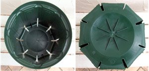 - <とんでもないポット10号> プロの果樹・樹木の栽培農家で愛用されている、多年栽培用ポットです。特殊な構造によりこれまでになく長い年数の栽培に耐えることが実証されています。ご家庭での花木や果樹の栽培におすすめです。鉢底裏の特殊構造により、根の旋回現象(サークリング)を防止し、鉢内で健全な根を形成します。また、用土内の水分を均一化し中心部に多くの根を育成し、コーナーと側面の段差により、根を下方へ誘導します。 弾力性のある軟質ポリ素材なので、樹皮の損傷を防止します。 色合いも落ち着いていますので、デザイン鉢感覚で利用できます。 色:モスグリーン 形状:8角形 サイズ:外径30cm、内径26cm、高さ26.5cm 実用新案登録済・特許申請済