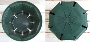 - ■とんでもないポット8号 プロの果樹・樹木の栽培農家で愛用されている、多年栽培用ポットです。特殊な構造によりこれまでにないほど長い年数の栽培に耐えることが実証されています。ご家庭での花木や果樹の栽培にもおすすめです。価格もお手ごろです。 鉢底裏の特殊構造により、根の旋回現象(サークリング)を防止し、鉢内のみで健全な根形を形成します。また、用土内の水分を均一化し中心部に多くの根を育成し、コーナーと側面の段差により、根を下方へ誘導します。 弾力性のある軟質ポリ素材なので、樹皮の損傷を防止します。 色合いも落ち着いていますので、デザイン鉢感覚で利用できます。 色:モスグリーン 形状:8角形 サイズ:外径24cm、内径20.5cm、高さ21cm