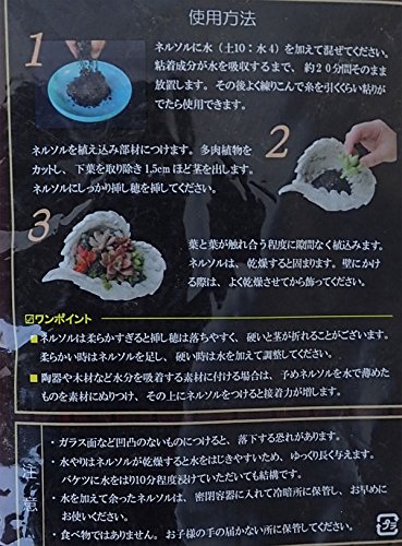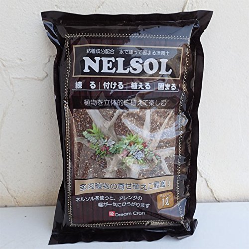 - 多肉植物の植え込み・加工に最適な粘着成分配合の培養土です。水を加えて練り込むと、しばらくして粘りが出てきます。ネルソルが柔らかいうちに植物を植え、培養土が乾燥して固まれば完成です。給水性・保水性が良く、リースにも最適です。主原料:ピートモス、ゼオライト、バーミキュライト、粘着剤ご使用方法:土10に対し水4を加え、よく混ぜます。しばらく練り込むうちに粘りが出てくるので、土を割った際に糸を引くくらい粘りがでたら準備完了。土が柔らかいうちに植物を植え込みます。壁面などにかける場合には、土の表面が乾いてから飾ってください。1袋1リットル入り、2袋セットです。
