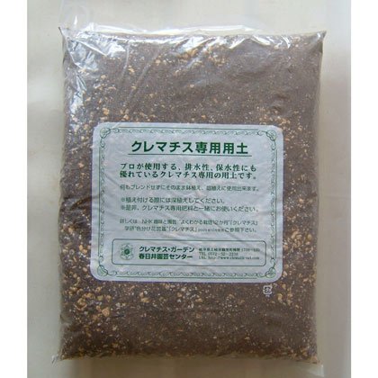 - クレマチスの専門ナーセリーが開発した、クレマチス用の植え込み用土です。この一袋で、3号(直径9cm)ポット苗を5号(直径15cm)鉢に植え替えるのに3株ほど植替えできる量です。利用方法:何もブレンドせずにそのまま鉢植えや庭植えにご使用いただけます。普通の培養土と一緒にご利用頂く場合には、クレマチスの根のよくはる下の方にこの専用用土をお使い下さい。原材料:調整ピートモス、くん炭、大粒赤玉土、パーライト、完熟牛ふん、苦土石灰1袋5リットル入りです。