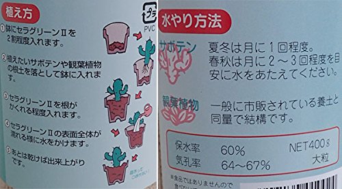 - セラグリーンIIは、多肉植物やサボテンの植え込み・加工に最適な粒状の培養土です。水で固まる新タイプの養土です。従来の土とは異なり清潔です。インテリアで栽培する観葉植物、多肉、サボテン類の植え込みに最適です。固まるので、土が飛ばず、鉢が倒れてもこぼれません。容量:400g入り粒の直径:約2~5mm
