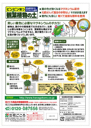 - 光合成を助けるマグネシウムを配合した、観葉植物にぴったりの土です。年1度の鉢替えの際にお使いください。観葉植物が生き生きと、大きく成長します。また、挿し木や株分けにもお使いいただけます。主な配合原料名:木質堆肥・バーミキュライト・軽石・ピートモス※緩効性化成肥料も含まれております。○使用方法(植え替え方)鉢から株を抜き固まった根をほぐしながら根鉢を1/3くらい崩し、痛んだ古い根を切り取ります。鉢底土、用土を入れ植え付けたら鉢底から流れ出るくらいたっぷりと水を与えます。根付くまで2週間程度日陰で管理します。5リットル入りと12リットル入りの各1袋セットです。