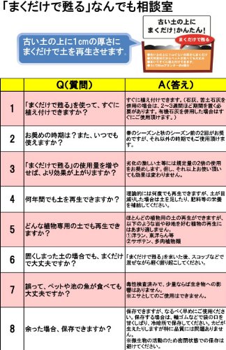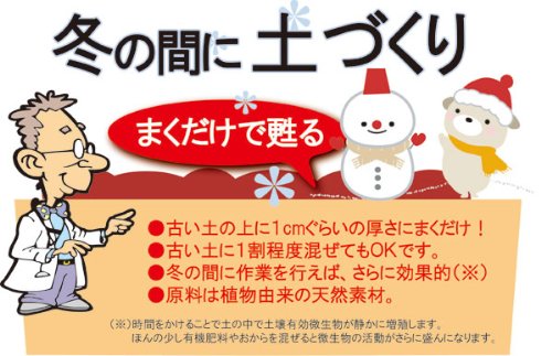 - 国内No.1の生産量・品質を誇る「土壌改良材」シリーズ。家庭園芸用土壌改良材としてエコマーク認定された土のリサイクル材です。土の表面にまくだけの手軽さで、土をふかふかに再生します。まいた後すぐに植物の栽培ができます。リサイクル材に含まれている有効微生物菌群が雑菌や老廃物を分解し、植物の根の成長を助け土中の環境を整えます。利用方法:古い土の上に本品を約1cmの厚さで均一にまきます。土に混ぜ込むことで、よりしっかりとしたリサイクルが可能です。利用量の目安:1袋(14リットル)で約1平米分です。4袋で4平米です。■この商品はメーカー直送にてお届けのため、下記サービスについてはお受けできません。・日曜祝日指定・時間帯指定(午前・午後の指定のみお受けできます。夜間指定はできません)・メッセージカードの添付・代金引換決済