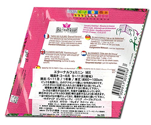 - フランスの花の種です。ピンクを基調に、白のアクセントを入れた優しい女性的な色合いのミックス種です。花壇向きです。とても美しい絵袋ですので、プレゼントにもお薦めです。裏面に簡単な栽培方法が記載してあります。