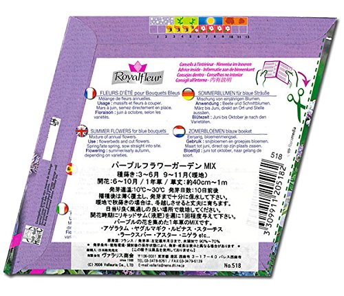- フランスの花の種です。紫色の草花だけを集めた1年草MIXです。とても美しい絵袋ですので、プレゼントにもお薦めです。裏面に簡単な栽培方法が記載してあります。<種の内容>・背の高いアゲラタム・ヤグルマギク(ブルー)・ルピナス ・ラークスパー(デルフィニュウム)・アスター・ニゲラ・スターチスその他まきどき:3~6月、9~11月(暖地)開花:6~10月発芽適温:10~30℃草丈:約40~100cm内容量:約3g★ロイヤルフルールのMIXガーデンは一袋で色々な草花が楽しめます。そのまま花壇にパラパラと蒔いたり、植木鉢に蒔いたり、種の種類を分けて種ごとに蒔いたり、色々な楽しみ方があります。基本的な種のブレンドはありますが、基本ブレンド以外の種も入っていて、毎年ブレンドが少しづつ変わります。絵袋サイズ:菱形 1辺約12.5cm★保存期間は2年以上と長く、ヨーロッパの中でも非常に品質の良い種です。ただし、種の保管状態によって数値は変わってまいります。種は高温多湿に弱いので、冷暗所で保管して下さい。保存期間は長いですが、なるべく早めにご使用いただく事をおすすめします。