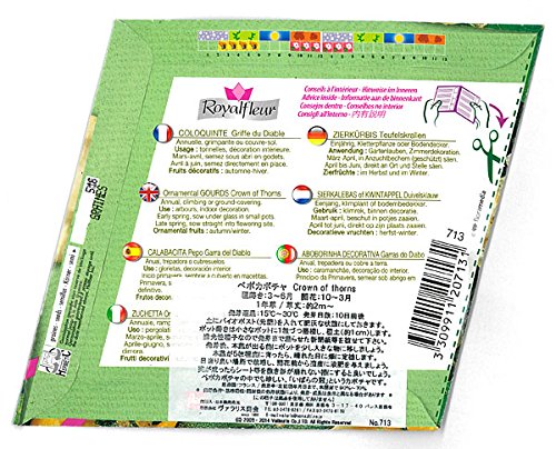 - フランスの種です。王冠のような形をした「観賞用」のペポかぼちゃのミックスです。※食用ではありませんのでご注意下さい。とても美しい絵袋ですので、プレゼントにもお薦めです。裏面に簡単な栽培方法が記載してあります。まきどき:3~7月開花:10~3月(まいた時期により変わってきます)発芽適温:15℃~30℃草丈:約2m~内容量:約2g絵袋サイズ:菱形 1辺12.5cm★保存期間は2年以上と長く、ヨーロッパの中でも非常に品質の良い種です。ただし、種の保管状態によって数値は変わってまいります。種は高温多湿に弱いので、冷暗所で保管して下さい。保存期間は長いですが、なるべく早めにご使用いただく事をおすすめします。