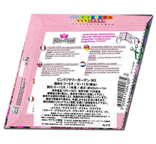 フランスの花の種です。ピンクの草花だけを集めた1年草ミックスです。<種の内容>・コスモス・ヤグルマギク・ゴデチャ ・ラヴァテラ・マローペ・アグロステンマ・クラーキア・キセランセマム その他まきどき:3~6月、9~11月(暖地)開花:6~10月(まいた時期により変わってきます)発芽適温:10℃~30℃草丈:約40~100cm内容量:約3g絵袋サイズ:菱形 1辺約12.5cm★ロイヤルフルールのMIXガーデンは一袋で色々な草花が楽しめます。そのまま花壇にパラパラと蒔いたり、植木鉢に蒔いたり、種の種類を分けて種ごとに蒔いたり、色々な楽しみ方があります。基本的な種のブレンドはありますが、基本ブレンド以外の種も入っていて、毎年ブレンドが少しづつ変わります。★保存期間は2年以上と長く、ヨーロッパの中でも非常に品質の良い種です。ただし、種の保管状態によって数値は変わってまいります。種は高温多湿に弱いので、冷暗所で保管して下さい。保存期間は長いですが、なるべく早めにご使用いただく事をおすすめします。