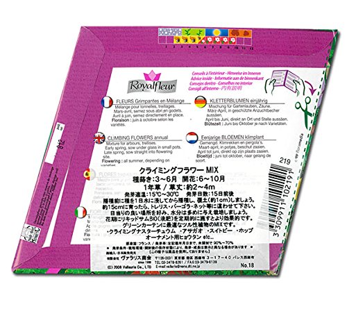 - フランスの花の種です。つる性の1年草MIXです。トレリスやネットに這わせましょう。植物のカーテンにしても素敵です。とても美しい絵袋ですので、プレゼントにもお薦めです。裏面に簡単な栽培方法が記載してあります。<種の内容>・ナスターチュウム ・アサガオ ・スイトピー ・オーナメンタルヒョウタン ・ホップ その他まきどき:3~6月開花:6~10月(まいた時期により変わってきます)発芽適温:10℃~30℃草丈:約2~4m内容量:約5g絵袋サイズ:菱形 1辺約12.5cm★ロイヤルフルールのMIXガーデンは一袋で色々な草花が楽しめます。そのまま花壇にパラパラと蒔いたり、植木鉢に蒔いたり、種の種類を分けて種ごとに蒔いたり、色々な楽しみ方があります。基本的な種のブレンドはありますが、基本ブレンド以外の種も入っていて、毎年ブレンドが少しづつ変わります。★保存期間は2年以上と長く、ヨーロッパの中でも非常に品質の良い種です。ただし、種の保管状態によって数値は変わってまいります。種は高温多湿に弱いので、冷暗所で保管して下さい。保存期間は長いですが、なるべく早めにご使用いただく事をおすすめします。