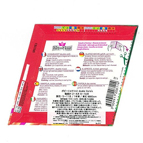 - フランスの花の種です。ヨーロッパ中部が原産。カラフルな大輪の花を咲かせる八重咲きのポピーです。切花としてもご利用いただけます。とても美しい絵袋ですので、プレゼントにもお薦めです。 裏面に簡単な栽培方法が記載してあります。