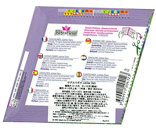 - フランスの花の種です。ジュビリージェムは草丈の低いブルーのヤグルマギクです。種まきから開花までの期間が短く、花壇の印象的な彩りとなります。切り花にも利用できます。とても美しい絵袋ですので、プレゼントにもお薦めです。裏面に簡単な栽培方法が記載してあります。