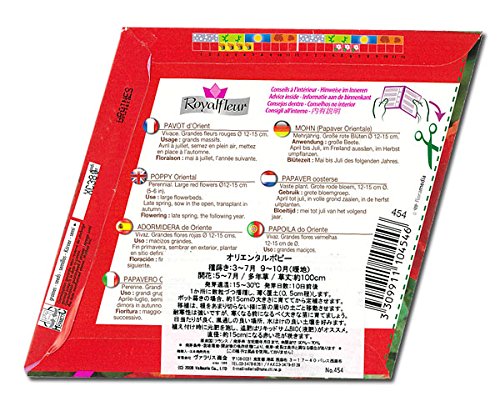 - フランスの花の種です。初夏の花壇を色鮮やかに演出してくれるオリエンタルポピー。とても豪華な花です。花壇のほか、切花でもお楽しみいただけます。とても美しい絵袋ですので、プレゼントにもお薦めです。裏面に簡単な栽培方法が記載してあります。まきどき:3~7月、9~10月開花:5~7月(まいた時期により変わってきます)発芽適温:15℃~30℃草丈:約100cm内容量:約0.5g絵袋サイズ:菱形 1辺約12.5cm★保存期間は2年以上と長く、ヨーロッパの中でも非常に品質の良い種です。ただし、種の保管状態によって数値は変わってまいります。種は高温多湿に弱いので、冷暗所で保管して下さい。保存期間は長いですが、なるべく早めにご使用いただく事をおすすめします。