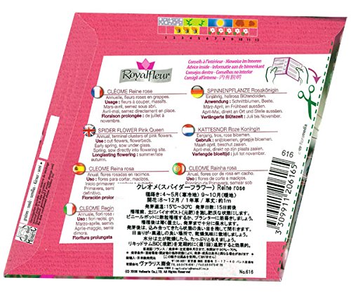 - フランス直輸入の種です。美しいピンク色のクレオメです。和名は「西洋風蝶草」、英名で「スパイダーフラワー」と呼ばれます。その姿を、日本人は蝶ととらえ、欧米では蜘蛛ととらえています。雄しべが長く飛び出した大きなカンザシのような優雅な花をつけます。とても美しい絵袋ですので、プレゼントにもお薦めです。裏面に簡単な栽培方法が記載してあります。タイプ:一年草まき時:4~5月(寒冷地)、9~10月(暖地)開花:8~12月(まいた時期により変わってきます)発芽適温:15℃~30℃発芽日数:15日前後草丈:約100cm内容量:約2g絵袋サイズ:菱形 1辺約12.5cm★保存期間は2年以上と長く、ヨーロッパの中でも非常に品質の良い種です。ただし、種の保管状態によって数値は変わってまいります。種は高温多湿に弱いので、冷暗所で保管して下さい。保存期間は長いですが、なるべく早めにご使用いただく事をおすすめします。