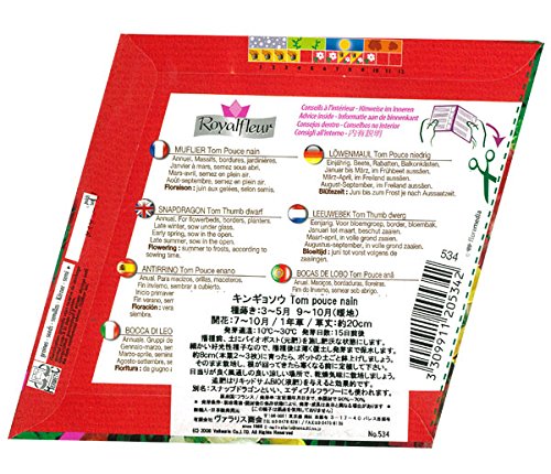 - フランスの花の種です。わい性の金魚草です。金魚草は別名スナップドラゴンとも呼ばれ、カラフルな花を咲かせ、花壇にぴったりです。エディブルフラワーとしても利用されます。夏から霜が降りる頃まで咲き続けます。とても美しい絵袋ですので、プレゼントにもお薦めです。裏面に簡単な栽培方法が記載してあります。