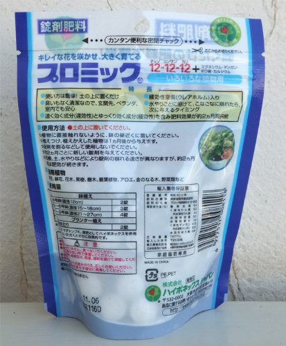 - 観葉植物・鉢花・野菜・プランター植えの植物などに適しており、安定した効果が約2ヶ月持続します。 ご使用方法:鉢土の上に置くだけです。 錠剤が崩れてきたら、新しい錠剤に取替えます。 ご使用の目安:4号で2錠、5~6号で3錠、7~9号で4錠、65cmプランターの場合は1株に付き2錠です。 1袋150g入りです。 N-P-K=12-12-12