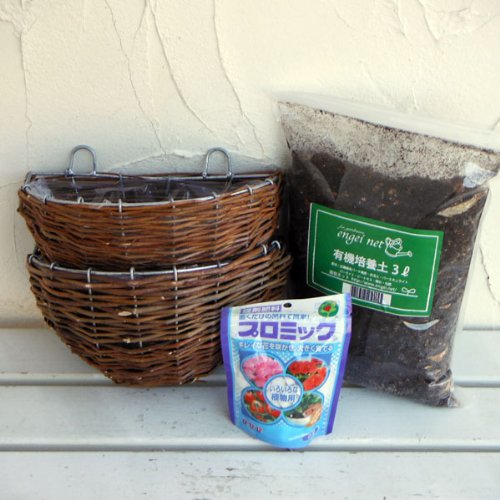 ナチュラルテイストの壁掛けタイプのハンギングバスケットと培養土と肥料のお買い得なセットです。 お好みの草花を植えてお楽しみください。 セット内容:G-StoryラタンウォールハンギングバスケットSサイズ×2個園芸ネットオリジナル培養土3リットル入り×1袋プロミック(いろいろな植物用)150g入り(12-12-12)×1袋<G-StoryラタンウォールハンギングバスケットSサイズ>自然素材で優しげな印象。 ナチュラルテイストの壁掛けタイプのハンギングバスケット。 デザイン性の高いラタンが素敵です。 丈夫なスチールの内枠つきで、背面上部に吊り下げ用のフックかけが2箇所あります。 内側はビニールシート貼り(水抜き穴数箇所つき)、吊り下げ用のS字フック2個つきです。