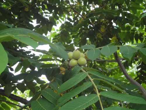 - 収穫方法: 10月下旬ころに実が熟します。自然落果もしてきますが、樹上で果皮が割れて中の胡桃が少し見えるようになったら長い棒で枝をたたいて実を落とすと効率よく収穫できます。落ちた実の果皮と果肉を手でむきます。むきづらいものはしばらく置いておくとむけるようになります。胡桃を取り出して洗い、自然乾燥させます。