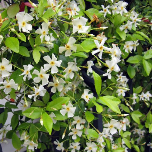 - タイプ:キョウチクトウ科の耐寒性常緑つる性木 植付け適期:4月半ば~9月半ば 開花期:5~6月 草丈:10m以上 日照:日向または半日陰むき