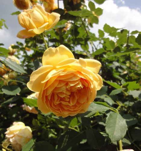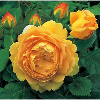 ゴールデン・セレブレーション(Golden Celebrathin)はイングリッシュローズの中でも最も花が大きな品種のひとつ。どんな気候やどんな用途でも使える品種です。短く剪定すればシュラブ樹形としても楽しめますし、長く伸ばせば短めのつるばらとしても十分利用できます。鮮烈な黄金色の花は巨大なカップ咲きとなります。形のよい樹形で形成されるシュラブは、丸みをおびたきれいなアーチを描きます。葉も多めです。数あるイングリッシュローズの中で最も育てやすい品種のひとつ。花は最初ティー香ですが、多くはソーテルヌ白ワインとイチゴのすばらしいコンビネーション香を発するようになります。ベストシュラブおよび最も香りのよい品種として2000年バラ賞はじめいくつかの賞を受賞。1992年作出。