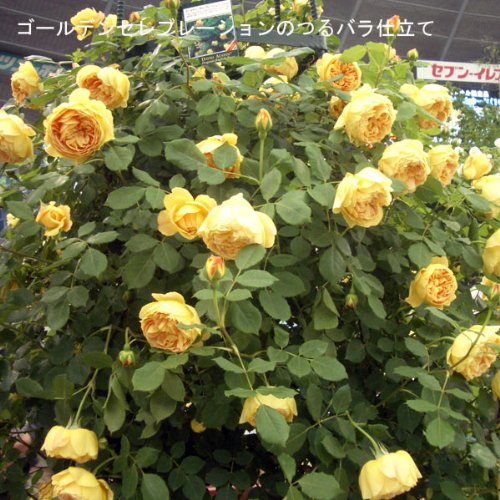 - ゴールデン・セレブレーション(Golden Celebrathin)はイングリッシュローズの中でも最も花が大きな品種のひとつ。どんな気候やどんな用途でも使える品種です。短く剪定すればシュラブ樹形としても楽しめますし、長く伸ばせば短めのつるばらとしても十分利用できます。鮮烈な黄金色の花は巨大なカップ咲きとなります。形のよい樹形で形成されるシュラブは、丸みをおびたきれいなアーチを描きます。葉も多めです。数あるイングリッシュローズの中で最も育てやすい品種のひとつ。花は最初ティー香ですが、多くはソーテルヌ白ワインとイチゴのすばらしいコンビネーション香を発するようになります。ベストシュラブおよび最も香りのよい品種として2000年バラ賞はじめいくつかの賞を受賞。1992年作出。