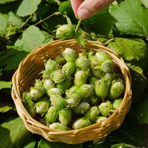 - ヘーゼルナッツはカバノキ科の落葉低木。和名は西洋ハシバミです。お菓子にもよく使われ、栄養素が高いといわれるアーモンドよりもオレイン酸が多く含まれています。生食も出来、上品なピーナッツのような味わいです。殻が割りやすく、苦みが少なくまろやかで、煎ることによるコリコリの食感が美味しいです。ナッツとして市販されているものは収穫してから時間が経っていますが、自宅で収穫してすぐにローストした果実はたいへん香ばしく、他では味わえないおいしさです。 フィルバートはアメリカの西側のほぼすべての地域に生育し、低木性で他の品種よりも強健で育てやすい品種です。ナッツの直径は約1.5cmくらいとなります。欧米では果実を包む苞(ほう)の短いものをヘーゼル、長いものをフィルバートと区別します。秋には紅葉も楽しめます。 1本で結実しますが、異品種を混植するとより実つきがよくなります。