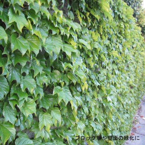 春から夏には美しい緑を、秋には紅葉を、冬には落葉後のつる模様と四季を通じて変化が楽しめるため大変人気があります。吸着根をだして壁面を這い上がる性質をもつので、ブロック塀、壁面に向いています。葉の形は幼苗時は3つに分かれていますが、成長すると変化します。浅く裂ける手のひら状になったり、完全に分かれる複葉状になります。 タイプ:耐寒性宿根草(落葉性) 草丈:5~20m(つる性) 植え付け適期:9月~6月 日照:日向または半日陰むき 用途:壁面、グランドカバー 栽培方法: 日当たりの良い適潤地に向いています。気根を出して壁面を這い登っていきますので、放任のままでも手がかからず、よく生育します。生育が旺盛で不必要な部分をこまめに剪定すると、よく分枝して密なカバーになります。 お届けする苗は3号(直径9cm)ポット入りです。 壁面緑化用に植栽される場合、1mあたり3~10株が目安です。 写真は成長時のイメージです。
