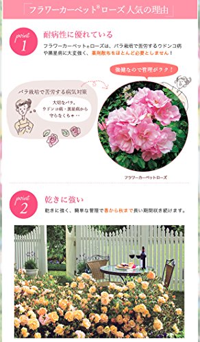 - フラワーカーペットローズは病気に強く手間のかからないグランドカバーローズ。 世界で1500万本以上も売れているベストセラー品種です。 非常に強健で手間がかからず、花のカーペットを敷きつめたように咲き広がるミニバラです。 ドイツのノアックローゼンによる35年以上の育種により作出された、耐病性に優れ、管理が簡単なグランドカバーローズです。 バラ栽培で苦労するウドン粉病や黒星病に大変強く、薬剤散布をほとんど必要としません。