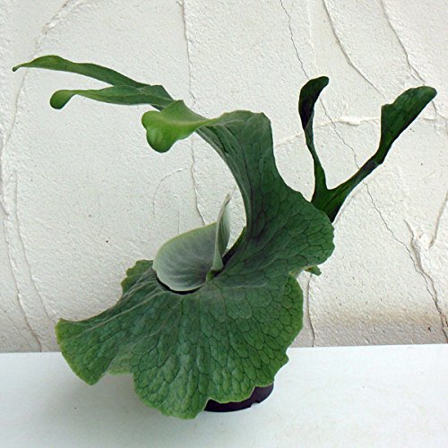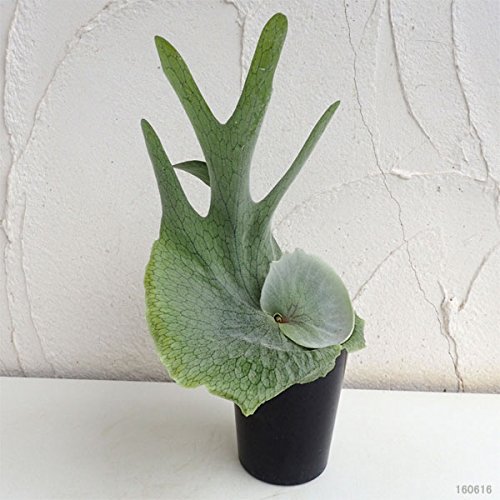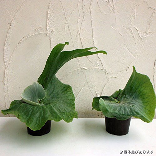 - こうもりが羽を広げた様な葉の形が印象的な着生シダの苔玉仕立て。和名の「ビカクシダ」は、鹿角(びかく)と言う様に、葉の形状が鹿の角に似ていることから名づけられたようです。エキゾチックな観葉植物としてお楽しみください。スパーバムは、円形で王冠のような形状が特徴的です。タイプ:ウラボシ科のビカクシダ属原産:オーストラリア・ニューカレドニア等の温帯雨林や熱帯雨林生育適温:20〜30℃耐寒性:乾燥気味で3℃日照:半日陰を好む管理方法:本来樹幹に着生する植物ですので、ヘゴ板等に紐で縛り、吊り下げて楽しむことが可能です。裸葉と胞子葉から為り、樹に密着する裸葉(外套葉)は早くから茶褐色となりますが、脱落しません。この裸葉が増えてきましたら、株分けが可能となります。尚、高温で空中湿度が高いことを好みますが、冬場乾燥気味に管理していただきますと、0℃でも耐えられます。育成期には土の表面が乾いたらたっぷりとあげるか、あるいは地上部にこまめに霧吹きをして下さい。また、時たま液体肥料を与えてください。お届けするのは、3.5号鉢(直径10.5cm)鉢植え、草丈15〜30cmです。個体差があります。
