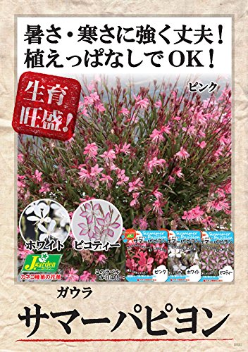 - 春から秋まで長く咲き分岐旺盛なので、そよ風に揺られて美しい蝶たちの可憐な舞いがお庭でみられることでしょう。 花壇に植えると大きく育ち、北海道でも越冬できるほどの耐寒性があるので、冬越しも簡単です。 タイプ:アカバナ科の耐寒性多年草 花期:4~11月 草丈:50~70cm 花径:3~4cm 日照:日向むき 用途:花壇、鉢植え、切花 栽培方法:
