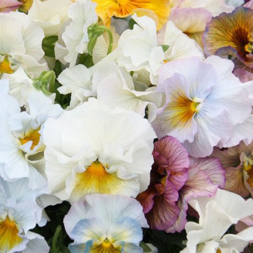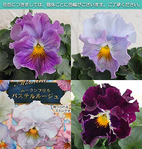 - ★大変人気がありまして、お届けに時間がかかる場合がございます。 どうかご容赦ください。 ★★小さい苗となります★★エディブルムーランとして利用できます★★毎年少しづつ色合いが変化しています。 今年の花色をお楽しみ下さい。 写真は過去のカラーとなりますので、色合いが異なる場合がございます。 また、1株1株色幅および季節、温度、環境によりまして花色等異なりますのでご了承ください。 ★パステル調で花のエッジに濃淡が入ります。 イタリア、ナポリの貴族 レナート ファラオネ メンネーラ(世界最古のナーセリー、ファーメン社)が育種した1輪として同じ花が咲かないフリル咲きのパンジー。 パステルカラーの美しいグラデーションと貴族のドレスを思わせる華麗なフリルの花びらにはうっとり。 花壇やコンテナ植えはもちろんですが切り花としても長期間楽しめます。 お庭もお部屋もさらに華やかにしてくれます。 花色を取り混ぜて花束にすると本当にきれいです。 また、育てた方からのリピートリクエストが最も多い、超人気品種です。 ■ムーランフリルパステルルージュはクリーム系、