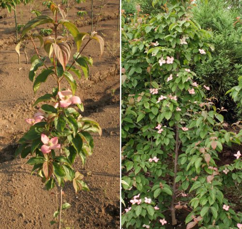 - ブルーミングピンクテトラは、常緑性のヤマボウシと大輪の赤花品種紅富士との交配種。日本初の2季咲き(返り咲き)品種で春から伸びる新枝の先端に2度開花する蕾をつけます。花は明るいピンク色で、秋の花は果実と同時に楽しめ、その後の紅葉は格段に美しいです。春の開花、夏の緑葉、秋の開花と果実、さらに紅葉と年間を通して楽しめます。耐暑性や夏の乾燥に強く、うどん粉病に対する耐性が強いのも特徴。樹形は整いやすく、シンボルツリーにおすすめです。