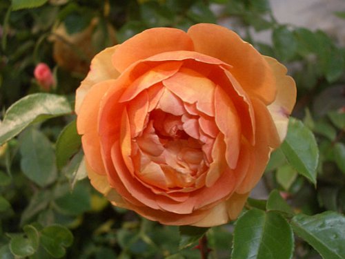 - 特異なほどに花付きの良い品種で、粒のそろった花が素晴らしい葉の上に広がります。 全体の印象は、輝くような暖かい銅色のシェードで、全体の感じはパット・オースチンのような印象ですが、パット・オースチンより花茎が強く、花が垂れません。 蕾の初期はリッチなオレンジ赤で、開いていくごとに丸みをおびた、聖杯のような花がつき、少しルーズめに花弁がならびます。 花弁の表側が美しいサーモン・ピンクで、裏側の黄金色に輝く魅惑的な配色と素晴らしいコントラストを作り出します。 聖杯のような、というとおり花弁の内部は比較的容易に覗くことができ、その深い色みは感動的なインパクトを与えます。