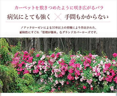 - フラワーカーペットローズは病気に強く手間のかからないグランドカバーローズ。 世界で1500万本以上も売れているベストセラー品種です。 非常に強健で手間がかからず、花のカーペットを敷きつめたように咲き広がるミニバラです。 ドイツのノアックローゼンによる35年以上の育種により作出された、耐病性に優れ、管理が簡単なグランドカバーローズです。 バラ栽培で苦労するウドン粉病や黒星病に大変強く、薬剤散布をほとんど必要としません。
