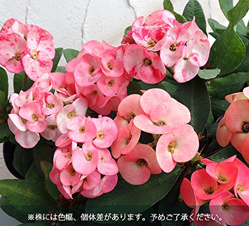 - 学名:Euphorbiamiliiタイプ:トウダイグサ科ユーホルビア属の常緑性多年草原産地:マダガスカル島草丈:30~90cm開花期:日中20度以上30度以下夜間15度以上 3万ルックス以上の光量が当たれば年間を通じて開花花径:2~3cm用途:鉢植え日照:日なた栽培方法:春から秋までは戸外でも楽しめますが、強光線や雨に当たると花が痛みやすくなるので、秋から春までは日当たりのよい場所に置き、真夏はレースのカーテン越しに置きます。
