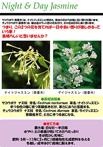 - 寒さに弱いので、鉢栽培でお楽しみください。 別売の昼香木(デイジャスミン)と一緒に育てるのもおすすめです。 学名:Cestrum noctunum 別名:夜香花 タイプ:ナス科ケストルム属の半耐寒性常緑低木