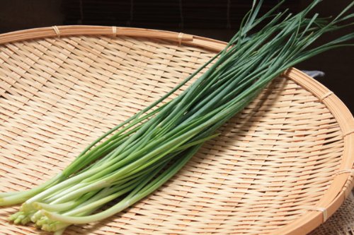 栃木県農業試験場で開発された「ねぎにら(なかみどり)」。新聞やニュースなどで紹介された話題の野菜です。地元宇都宮のネギ「新里ネギ」を母親、ニラ「きぬみどり」を父親の胚培養により誕生しました。しゃきしゃきとした歯ごたえと、ニンニクのような香りをもつ新野菜です。おすすめはもちろん餃子の具!その他、おひたし、ぬた、サラダ、漬物、鍋物、炒め物など、さまざまにご利用いただけます。また、花やつぼみも利用できます。蕾はサラダやおひたしに、花はてんぷらにおすすめです。カロチン、鉄分、リン、繊維質、糖質などすべてネギとニラより多く含み、栄養満点です。 品種名「なかみどり」は、栃木県を流れる那珂川の「なか」と、父親の「きぬみどり」に由来します。胚培養なので、花は咲きますがタネはできません。